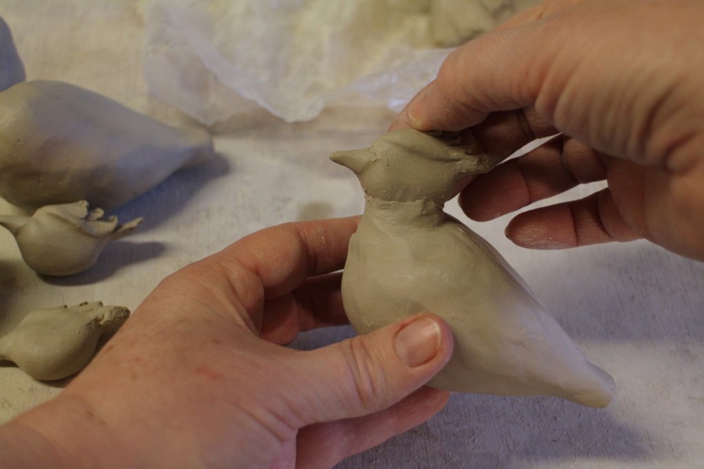 Mit etwas Tonschlicker als Klebstoff verbinde ich Kopf und Körper des Vögelchens.