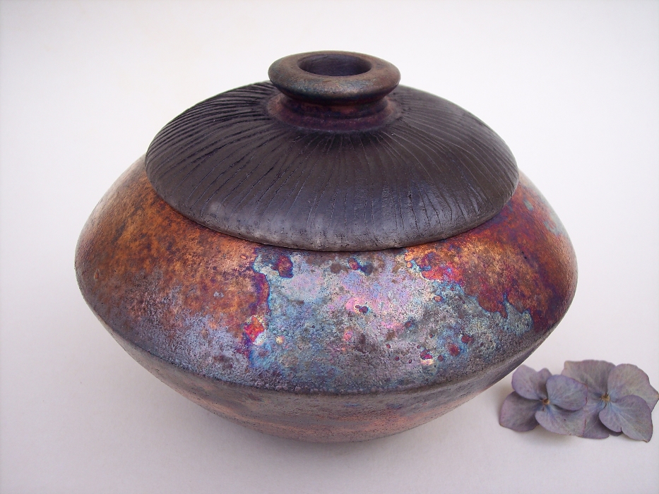 Vollendet wird meine Arbeit im Brand. Durch das Zusammenwirken von verschiedenen Glasurtechniken, dem Feuer, rascher Abkühlung und anschließendem Räucherbrand entsteht eine Oberfläche von besonderer Schönheit und Ausstrahlung. Dieser Prozess kann zwar bedingt gelenkt werden, doch immer bleibt bei Raku Keramik ein Anteil von nicht steuerbaren Faktoren, die das endgültige Ergebnis zu einer Überraschung machen.